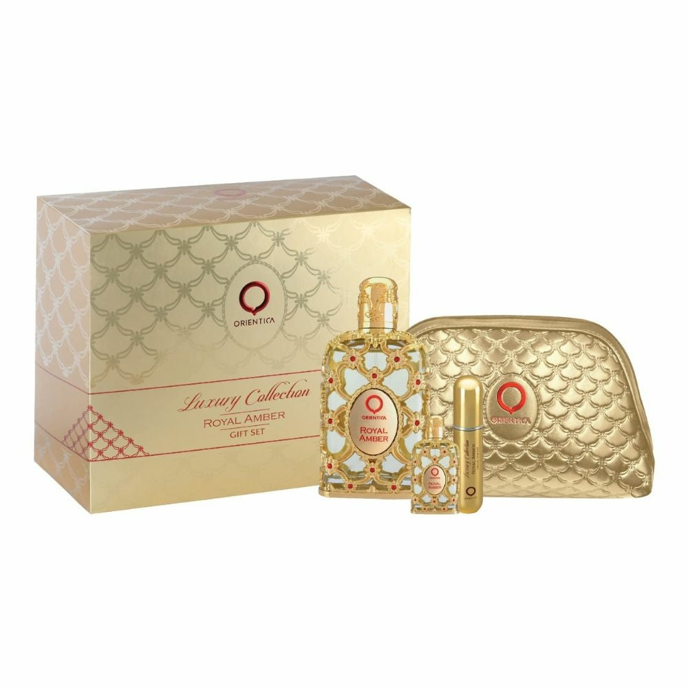 Esse kit contém um frasco de 80ml de perfume Royal Amber, uma miniatura de 7,5ml perfeita para levar em viagens ou na bolsa, um refil de 10ml para repor o frasco principal, além de uma necesserie elegante para guardar e transportar seus itens de cuidado pessoal.